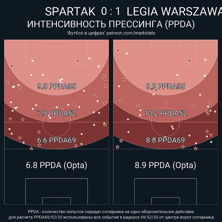 Важно отметить, что виноват не только Умяров, но и система «Спартака» — она просто распадалась на тройку прессингующих и двух опорных, которым не хватало поддержки (поддержки в давлении, с компактностью все было более- менее). Если Витория хотел плотно перекрыть центр и не давать полякам выходить через зону, то одному из оборонительной линии хозяев нужно было выдвигаться в опорную зону и играть там агрессивнее. Несмотря, что линия обороны играла очень высоко и практически не ошибалась, необходимая плотность была только при фланговых ловушках; пожалуй, это «Спартак» Витории освоил хорошо. Да, возможно «красно- белые» опасались передач за спину и рывков (они все равно проходили, хоть и не были опасны), но тогда действовать нужно было низким блоком. При всем этом цифры "Спартака» при прессинге выглядят довольно неплохо: