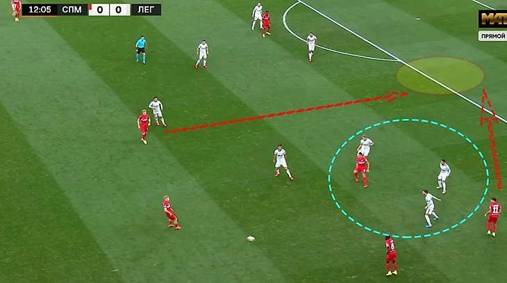 2) Рассказову отдают передачу, но варианты перекрыты, в результате разворот и пас на Максименко: