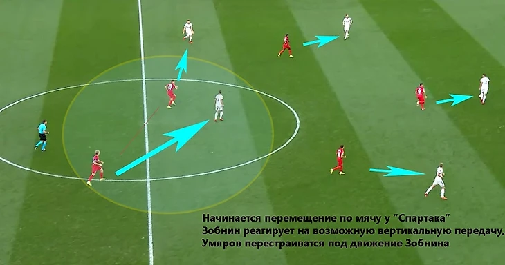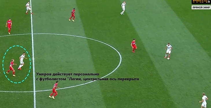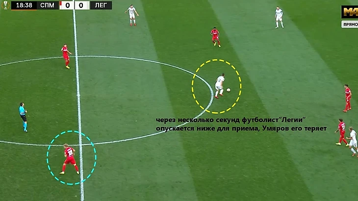 Вообще, это не только проблема построения «Спартака» и командного взаимодействия, но и личная проблема Умярова, как игрока без должных оборонительных навыков. А идет она из юношеского футбола; очевидно, Наиля просто не учили играть в такой интенсивности (или не успевает на таком уровне), а уделяли внимание развитию его атакующих навыков. По ходу первого тайма Наиль допустил еще несколько таких ошибок: