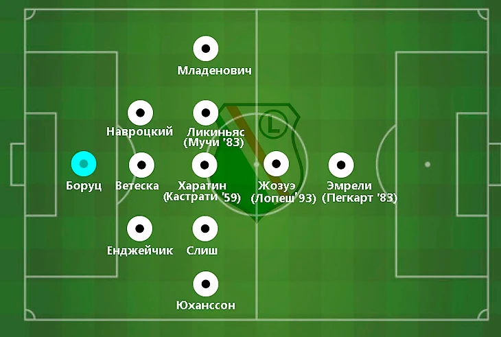 «Легия" в этом сезоне тоже преимущественно играет по похожему модулю в 3-4-3 или 3-5-1-1, но по сравнению с последним матчем чемпионата Польши было произведено пять замен в стартовом составе.