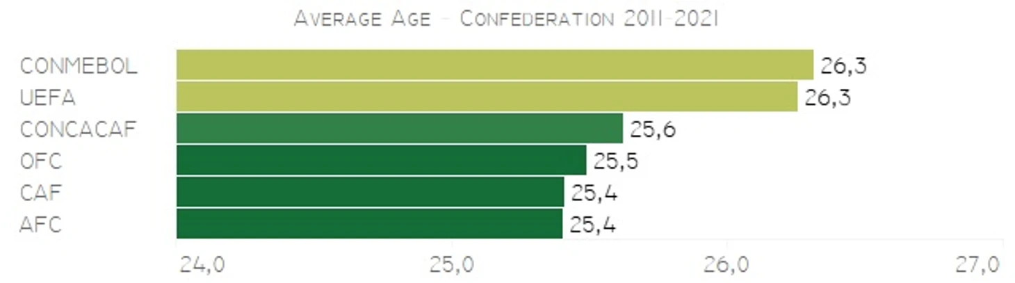 Для начала посмотрим на средний возраст в различных конфедерациях. Лидируют здесь Южная Америка и Европа с показателем 26.3 года, что почти на год больше, чем в Африке и Азии.