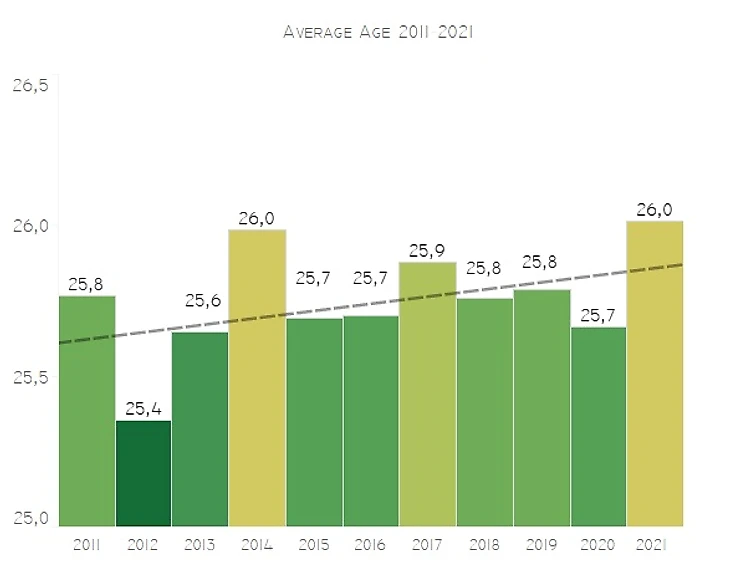 Если же посмотреть аналогичный график для сборных, входящих в топ-50 мирового рейтинга, то можно обнаружить, что увеличение среднего возраста здесь более заметно, на 2021-ый год средний возраст составляет уже 26.5 лет и тенденция на увеличение возраста выглядит уже более явной.