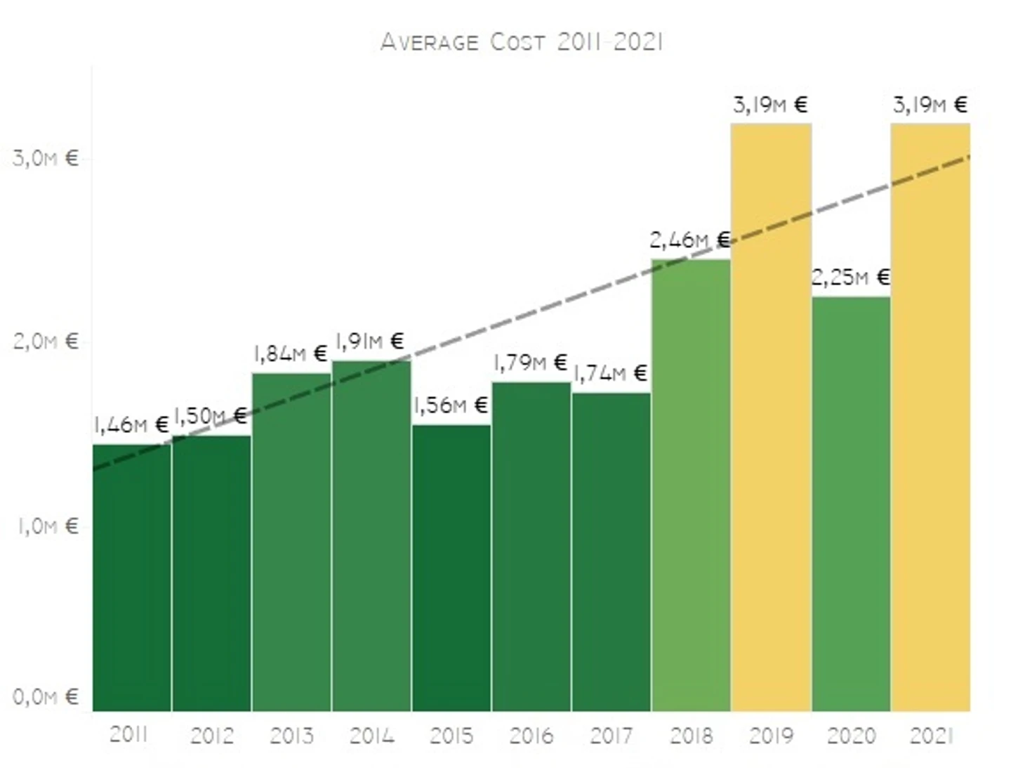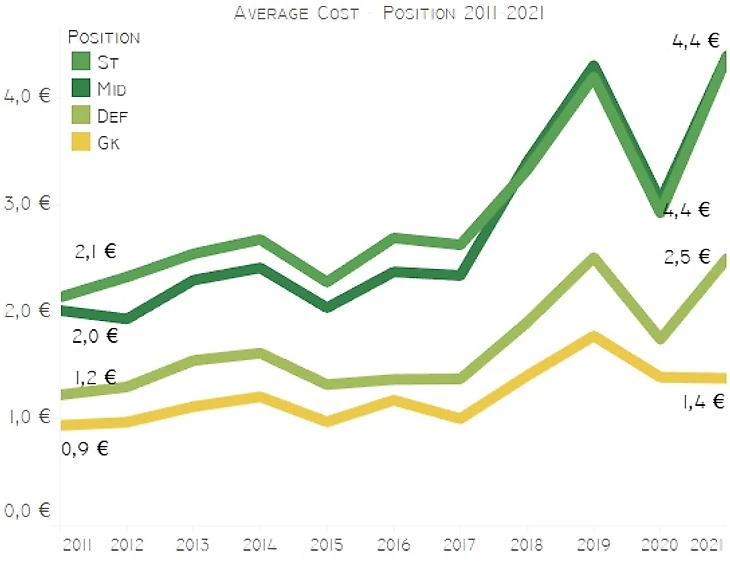 Средняя стоимость футболиста уровня национальной сборной за последние 10 лет увеличилась больше чем в два раза. На графике очень четко заметно, как "коронавирусный" 2020-ый год повлиял на стоимость игроков. За последний год цены восстановились и достигли показателей 2019-го года. В целом, средняя стоимость очень хорошо коррелируется с инфляцией в Еврозоне, что особенно заметно по 2015-му и 2020-му году.