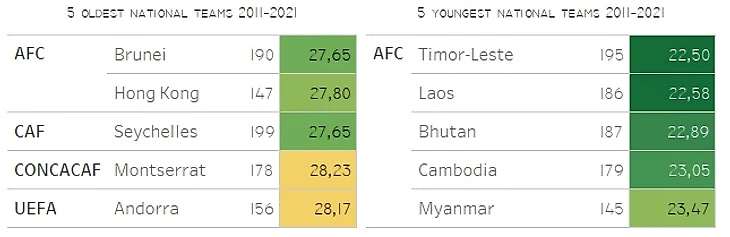 В топ-5 самых молодых сборных мира неожиданно оказались представители только одной конфедерации - азиатской. Самой молодой является национальная команда Восточного Тимора, которая располагается на 195-ой строчке рейтинга ФИФА. В последнем созыве сборной не было ни одного игрока старше 30-ти лет. Однако для государства с миллионным населением выступает команда не очень удачно. На первом же этапе отбора Восточный Тимор выбыл, дважды разгромно проиграв Малайзии. Так что можно сказать, что в заочном споре молодости и опыта пока побеждает опыт.