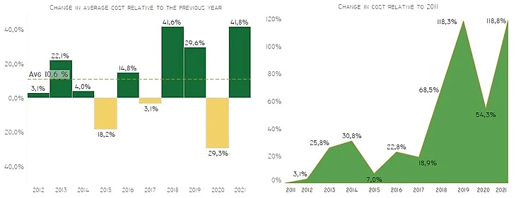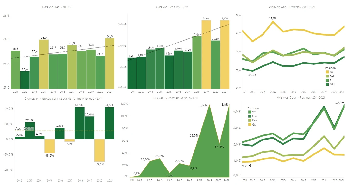 В среднем стоимость футболистов каждый год увеличивается на 10.6%. На первом графике мы наблюдаем, что увеличение стоимости происходит практически каждый год - исключением стали только 2014-ый, 2016-ый и 2020-ый год, когда происходила дефляция цен. На втором графике можно посмотреть, как изменились цены относительно 2011-го года. На текущий момент увеличение стоимости составляет 118.8%, то есть, если в 2011-ом году среднестатистического футболиста национальной сборной можно было приобрести примерно за 1.5 млн евро, то в 2021-ом за такого же игрока нужно отдать уже 3.2 млн евро.