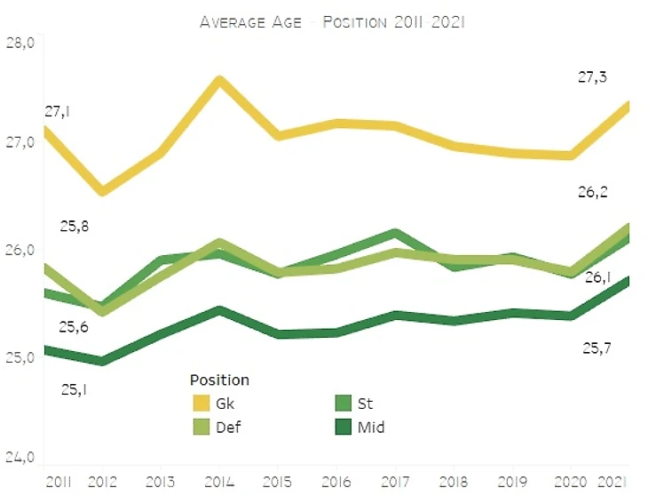 Здесь ничего неожиданного: самые возрастные в сборных, как всегда, вратари, самые молодые - полузащитники. Все просто и логично. Возраст нападающих и защитников, как был примерно одинаковым в 2011-ом, так и остался таким же в 2021-ом - разница между показателями всего 0.1 года. Больше всего постарела за 10 лет позиция полузащитника - на 2.4%.