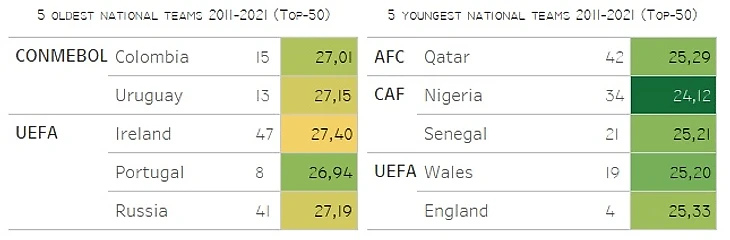 В топе самых старых сборных представители довольно успешных конфедераций - европейской и южноамериканской. Выделяется на общем фоне чемпион Европы 2016-го года - сборная Португалии. Лидерами команды являются игроки, которым уже сильно за тридцать - Криштиану Роналду (36 лет), Пепе (38 лет), Жоау Моутинью (35 лет) и Руй Патрисиу (33 года). Примечательно, что в топе рейтинга самых возрастных сборных находится и сборная России. Благодаря появлению в составе Захаряна, Тюкавина и Мухина средний возраст команды в 2021-ом году снизился до 26,4 года, при том, что в прошлом году этот показатель равнялся 28 годам.
