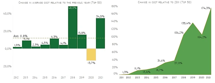 Если смотреть график изменения стоимости для футболистов из топ-50, то можно заметить, что в отличие от общего графика у топовых сборных средняя стоимость игроков плавно росла вплоть до 2017-го года без уменьшения в 2015-ом, а затем последовали резкий скачок в год проведения ЧМ в России, падение цен из-за коронавируса и, наконец, еще один резкий скачок в год проведения ЧЕ. Корреляция с инфляцией в Еврозоне уже не такая заметная, увеличение стоимости не происходило только в 2020-ом году. В целом же, стоимость футболистов из топ-50 за 10 лет выросла практически в три раза.