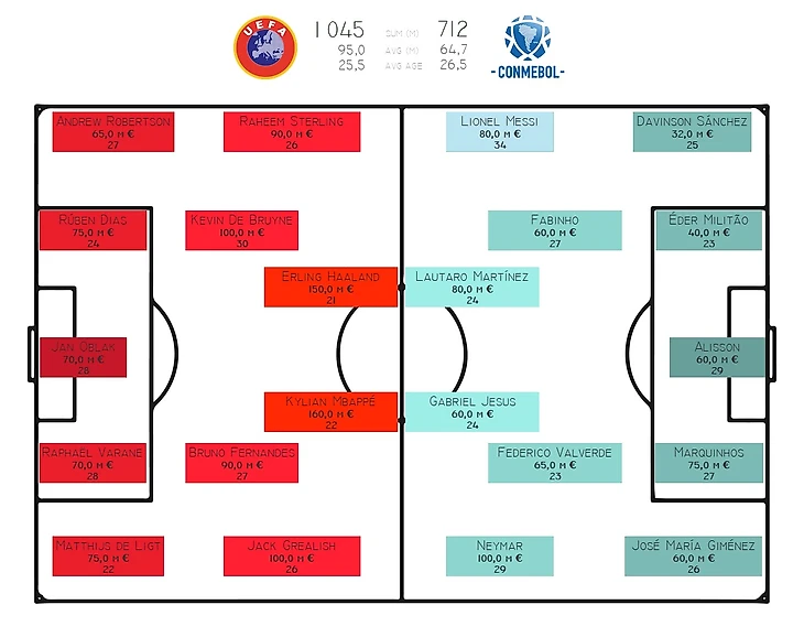 Сборные каждой конфедерации составлялись по схеме 4-4-2. В каждой линии представлены самые дорогие игроки на позиции без привязки к флангам, поэтому, например, у южноамериканцев сразу 4 центральных защитника в составе. Европейская сборная получилась на 50% дороже и младше ровно на год. Примечательно, что ровно половина всех игроков выступает в английской премьер-лиге.