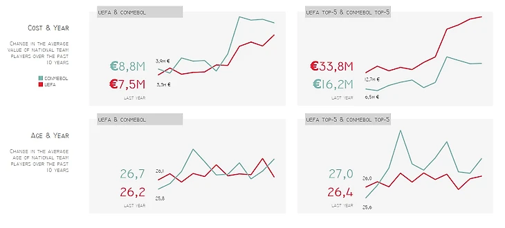 Если сравнивать среднюю стоимость игроков всех сборных, входящих в UEFA и CONMEBOL, то небольшое преимущество по средней стоимости игроков за южноамериканцами, но при этом в первой половине последнего десятилетия стоимость была практически равной. Сейчас же разница в средней стоимости составляет 15%.