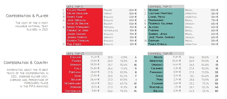 В втором ряду таблицы с информацией по десяти сильнейшим сборным Европы и десяти южноамериканским национальным командам. В таблицах слева-направо указаны средняя стоимость игроков, средний возраст, процентов игроков, выступающих за рубежом, и место в рейтинге ФИФА. Сборные отсортированы по средней стоимости игроков.
