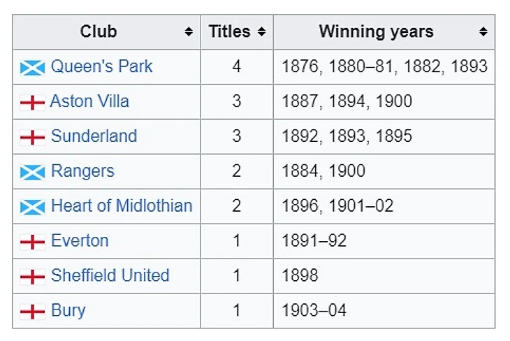 Как видите-первое время доминировали шотландские клубы, но потом англичане усилившись «профессорами» с севера начали побеждать всё чаще. С ростом интереса к этому виду спорта и повышением уровня квалификации футболистов в Европе и Америке уже не было убедительным называть исключительно британское соревнование «чемпионатом мира». К началу Первой мировой войны произошло слишком сильное изменение футбольного ландшафта, и турнир решили больше не проводить.