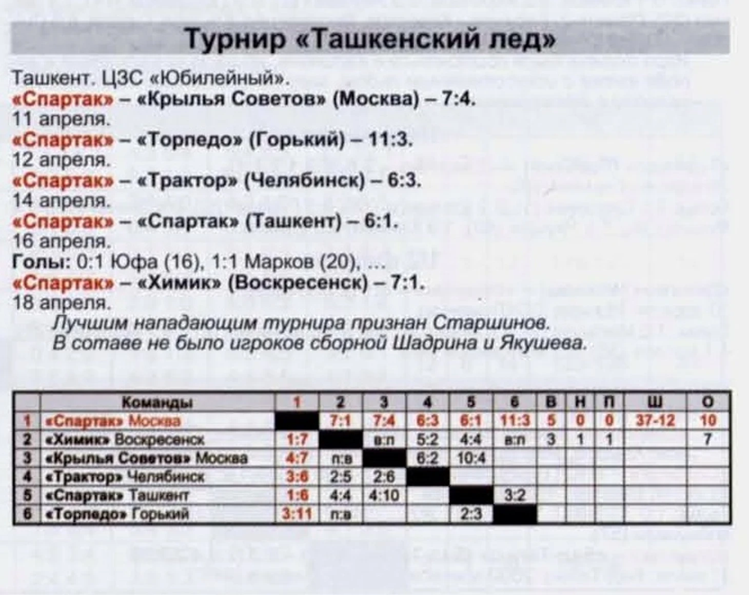«Четвертое место «Спартака» в турнирной таблице - результат неплохой. Ташкентцы провели 52 поединка, забросили в ворота соперников 229 шайб, а пропустили в свои 163. По забитым шайбам «Спартак» на втором место, по пропущенным - на пятом. Кто же авторы этих шайб? Виктор Каштанов —30, Юрий Фомин —29, Борис Новиков — 24, Борис Куренной—21, Константин Юфа—18, Виктор Пашнин и Вячеслав Орчаков — по 16, Игорь Власкин—15, Геннадий Гусев — 12, Анатолий Слухов—8, Владимир Прокопьев—8, Александр Стеблин—7, Герман Николаев—6, Владимир Тарасов—6, Сергей Бизяев—5, Валентин Григорьев—4, Александр Зарубин—4. Одну шайбу о свои ворота забросил игрок алма-атинского «Автомобилиста» А. Куликов.