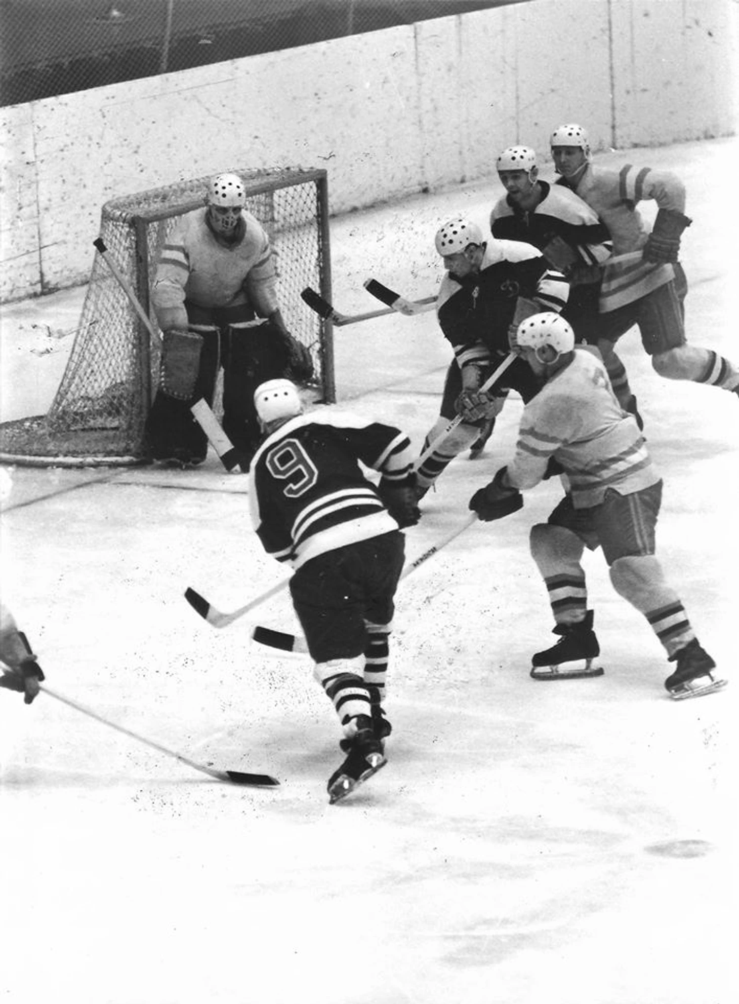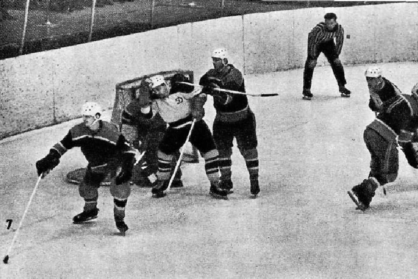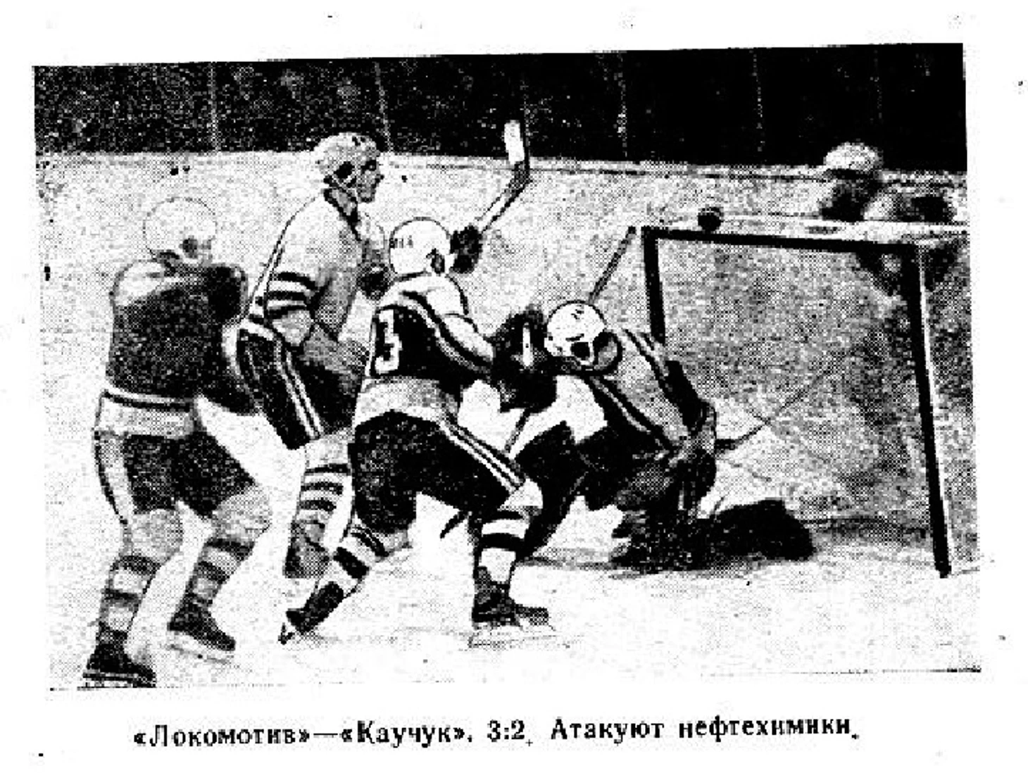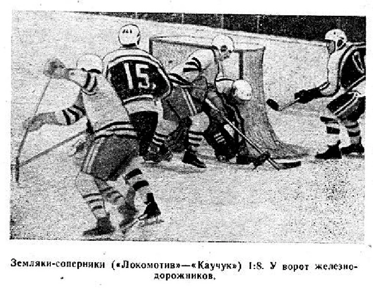Сезон 1966/67. Новосибирец В. Григорьев выталкивает с пятачка московского динамовца А. Сакеева.