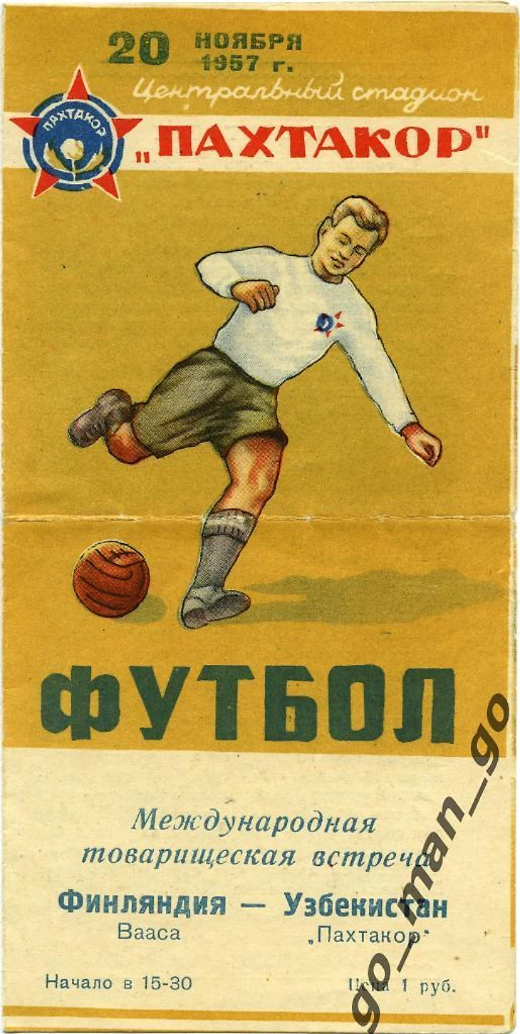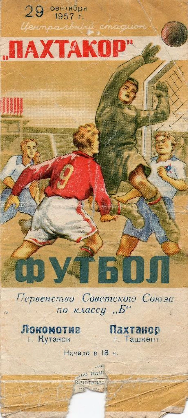 Вот программка к игре с кутаисским «Локомотивом». По ней цвета формы «Пахтакора» определять нельзя, так как эта программка калька московской со стадиона имени Ленина. Ташкентский художник лишь предал азиатские черты защитнику и вратарю, а также дорисовал эмблему, а цвета оставил как в оригинале.