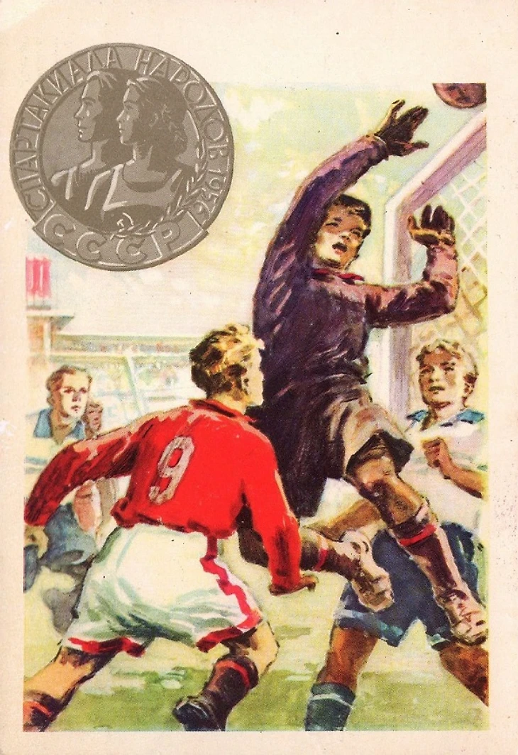 Но скорее всего оригиналом была вот эта открытка, выпущенная издательством «Правда» (художник И. Слуцкер) в 1956 году к Спартакиаде народов СССР.