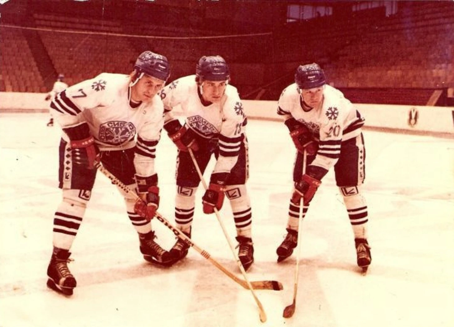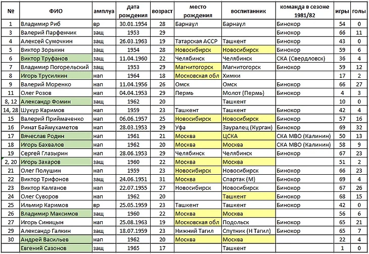 В прошлом сезоне - 1981/82 годов - москвичей в ташкентской команде не набиралось и на одну пятерку. Воспитанниками московского «Спартака» были защитник Виктор Трифонов и нападающий Аркадий Андреев (он сыграл всего 8 игр и, скорее всего, покинул команду в ходе сезона - так, что его можно не считать), в Подольске вырос молодой форвард Игорь Синицын, а Ринат Баймухаметов получил квартиру от того же столичного «Спартака» на улице Народного Ополчения. И все. Следовательно, о своих московских хоккейных корнях в Ташкенте вспомнили перед сезоном 1982/83 годов. Кто же из новичков команды мог быть москвичами? Совершенно точно, что защитник Виктор Труфанов, пришедший из свердловского СКА, уроженец и воспитанник Челябинска (до этого играл в «Тракторе» и «Металлурге»). Юный игрок обороны Евгений Сазонов (1965 г.р.), сыгравший лишь в одной игре, наверное, являлся выпускником собственной школы. А вот остальные новобранцы: защитники - Игорь Захаров, Владимир Максимов и Александр Фомин; нападающие - Игорь Бахвалов, Андрей Васильев, Вячеслав Родин и Игорь Трусилкин - могли быть москвичами. Нашел информацию, что Трусилкин, так же как и Синицын, был воспитанником подмосковного хоккея, только не из Подольска, а из Химок. А Бахвалов и Родин пришли из дочерней команды московских армейцев - СКА МВО (Калинин). Ранее, в сезоне 1978/79 годов, первый играл за московский «Локомотив», а второй за молодежку ЦСКА. И если остальные тоже имели отношение к столице, то тогда получается, что команда «состояла наполовину из москвичей».