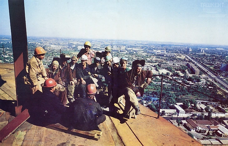 1982. Ташкент. Вид на Юнусабадский район со строящейся телебашни; справа - улица Энгельса. Ташкентская телебашня (архитекторы: Ю.П. Семашко и Н.Г. Терзиев-Царуков, инженеры: Е.П. Морозов и М.Д. Мушеев) самая высокая телебашня в Средней Азии - 375 метров