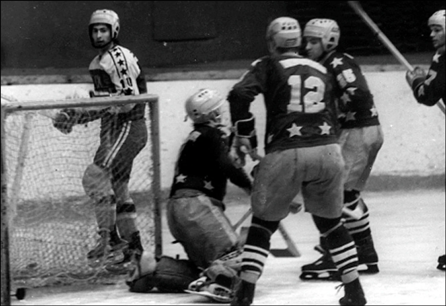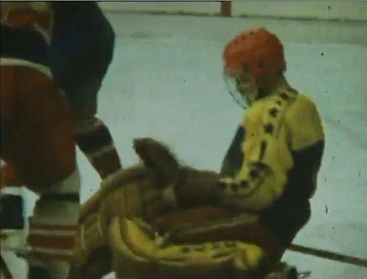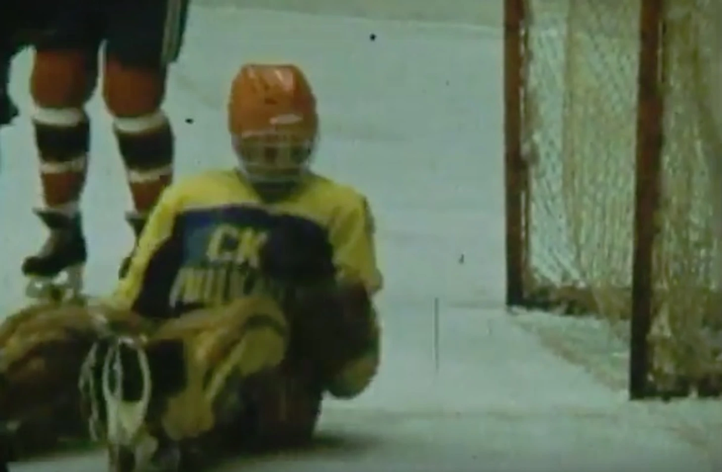 «Кристалл» (Саратов) - «Бинокор». Вратарь Ильмир Каримов отражает атаку соперника (фото Николая Титова из книги Станислава Гридасова «Кристальные люди»)