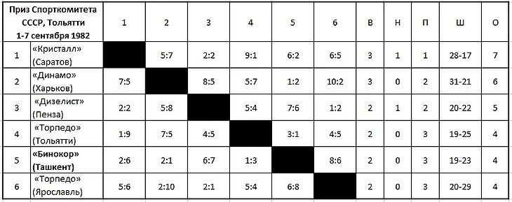 Итоговая таблица турнира на приз Спорткомитета СССР в Тольятти (1 - 7 сентября 1982 года)