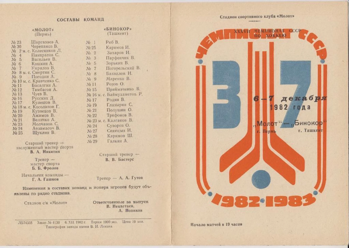 Программка пермского стадиона СК «Молот» к играм «Молота» и «Бинокором» в декабре 1982 года