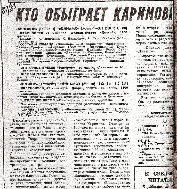 «В прошлом году (в чемпионате 1982-83 годов) команда по давней традиции весьма уверенно провела первые матчи чемпионата. Так, после 8-го тура «Бинокор» занимал в турнирной таблице второе место после «Сибири». В пассиве команды было всего одно пораже­ние (от «Металлурга»). А единственную ничью с харьковским «Динамо» в гостях скорее следует отнести в актив клуба. Но в последующих тринадцати (!) турах хоккеисты Ташкента одержали всего одну победу и прочно до конца сезона забронировали за собой 9-е место.» (из программки череповецкого СКЗ «Алмаз» к матчам 10-11 декабря 1983 года между «Металлурга» (Череповец) и «Бинокором»).