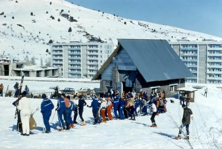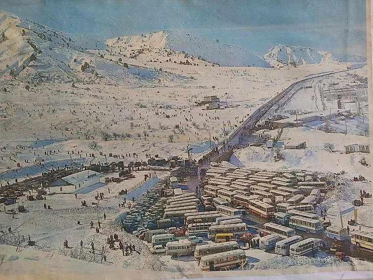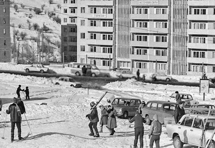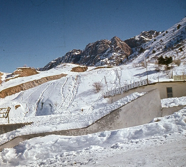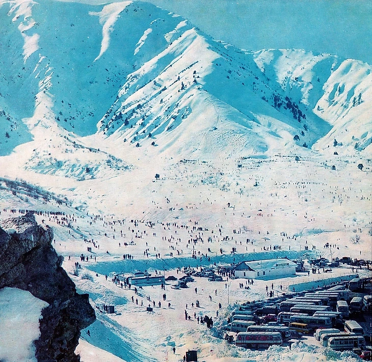 1984. Чимган. Ташкентцы проводят выходные дни на горных склонах. На заднем плане туристический комплекс «Чимган» (снесен несколько лет назад) фотограф Григорий Пун