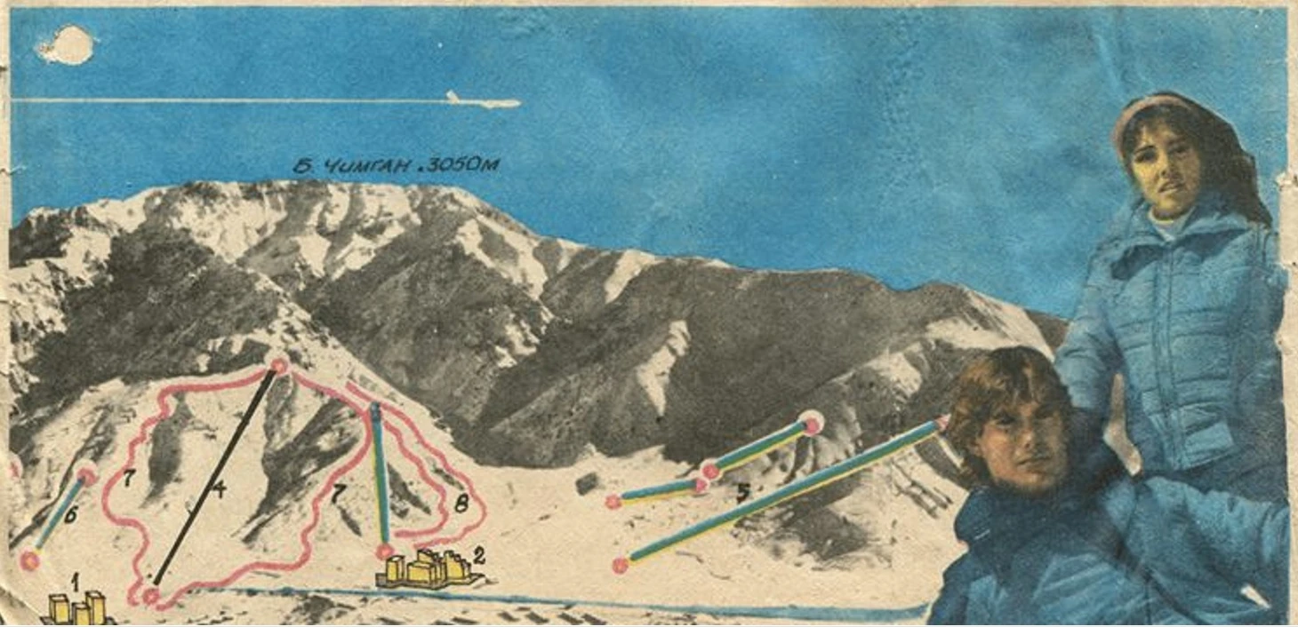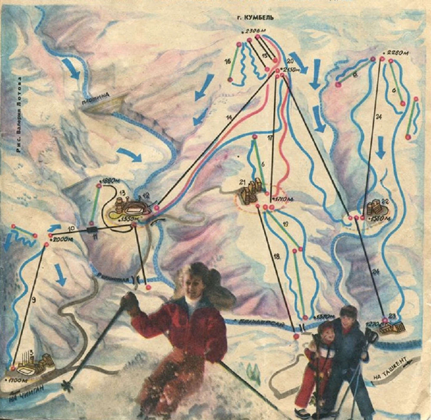 Урочище Чимган 1) Поселок Чимган 2) Гостиничный комплекс 4) Парнокресельная канатная дорога - длина 1 000 метров, пропускная способность 600 человек в час 5) Буксировочная канатная дорога - длина 900 метров 6) Малые буксировочные канатки 7) Трассы слалома-гиганта - 1 600 метров 8) Трассы специального слалома (рисунок Владимира Лотова)