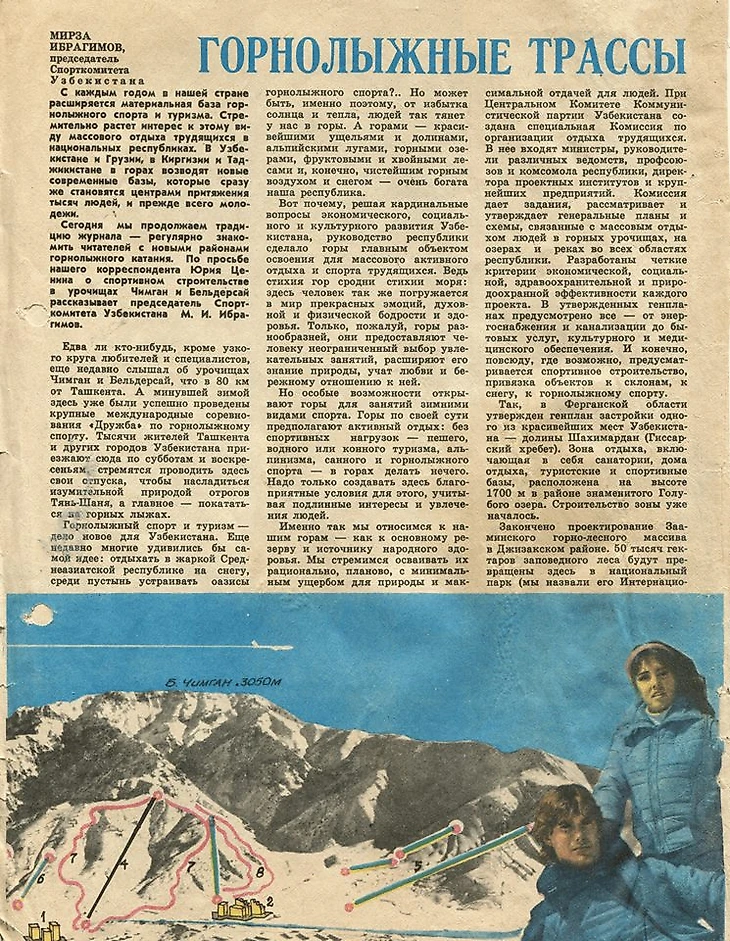 «Едва ли кто-нибудь, кроме узкого круга любителей и специалистов, еще недавно слышал об урочищах Чимган и Бельдерсай, что в 80 км от Ташкента. А минувшей зимой здесь уже были успешно проведены крупные международные соревнования «Дружба» по горнолыжному спорту. Тысячи жителей Ташкента и других городов Узбекистана приезжают сюда по субботам и воскресеньям, стремятся проводить здесь свои отпуска, чтобы насладиться изумительной природой отрогов Тянь-Шаня, а главное - покататься на горных лыжах.