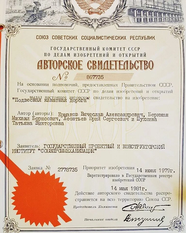 Авторское свидетельство на изобретение «Подвесная канатная дорога»