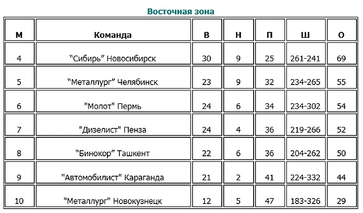 Таблица Восточной зоны после первого этапа (с результатами игр)