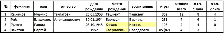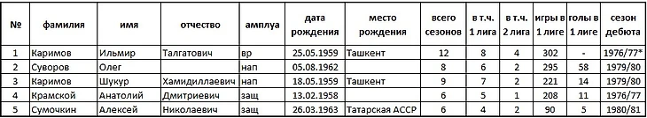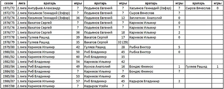* - Ильмир Каримов в команде с сезона 1974/75 годов, в матча чемпионата страны впервые вышел в сезоне 1976/77 годов