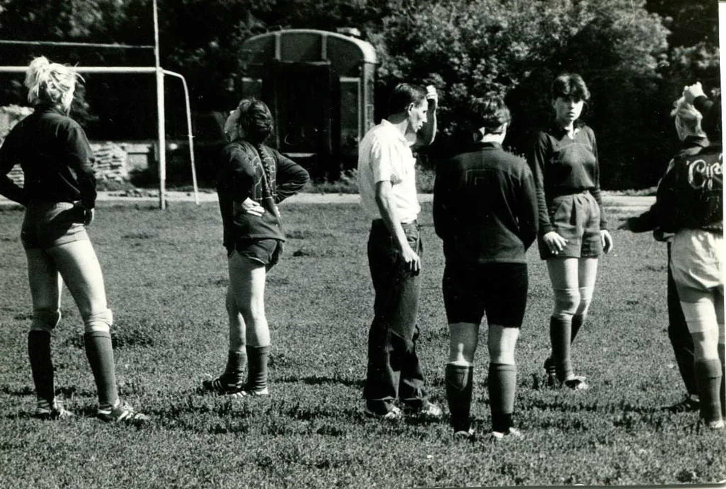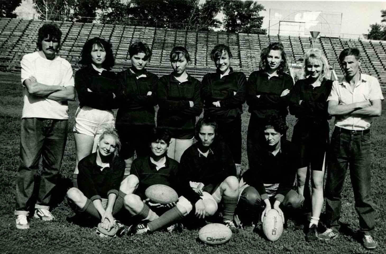 1992 год. Барнаул. Женская регбийная команда «Согдиана» (Ташкент). Верхний ряд (слева направо): тренер Б.В. Червяков, Э. Бигильдина, Т Баранова, О. Певзнер, С. Кабанова, Р. Захарова, старший тренер О.В. Галкин, Л. Мастель; нижний ряд (слева направо): А. Зуева, Е. Певзнер, Е. Захарова, Н. Вороненко
