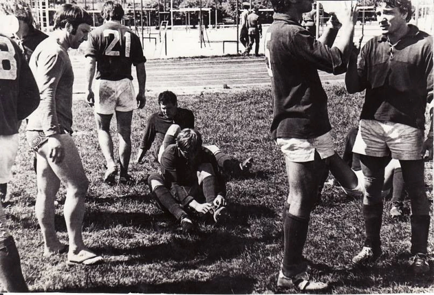 Май 1971 года. Ташкент. Стадион «Строитель». Регбисты куйбышевского «Маяка» в перерыве матча с ферганским «Химиком», выигранного со счетом 45:6