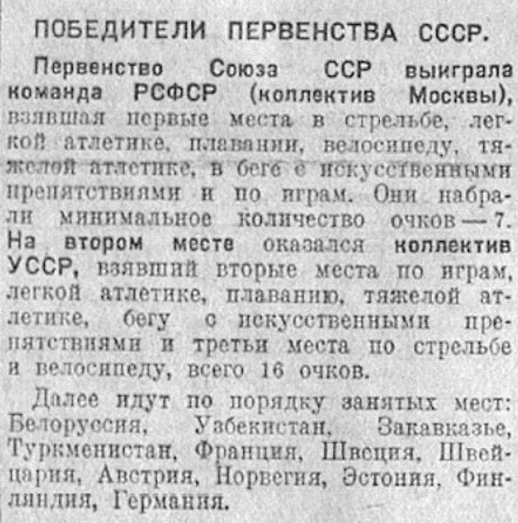 Итоги общекомандных соревнований Спартакиады, опубликованные в газете «Известия ЦИК СССР и ВЦИК» 25 августа 1928 года
