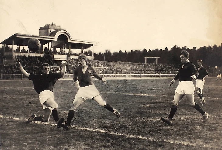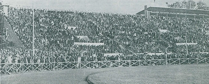 Август 1928 года. Зрители на трибунах стадиона МГСПС внимательно следят за развитием событий на футбольном поле во время Спартакиады