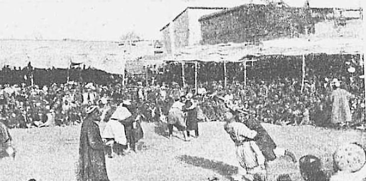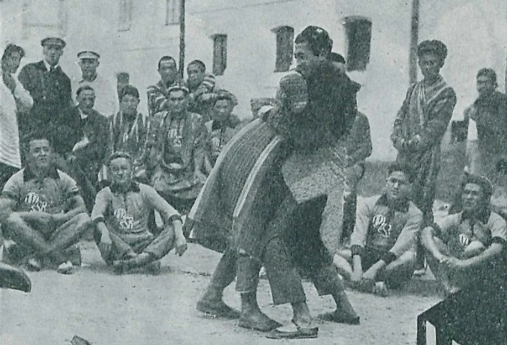 «Интересный момент узбекской национальной борьбы, также пользующейся большой популярностью среди населения» (еженедельный журнал «Физкультура и спорт» № 9 за 2 марта1929 года)