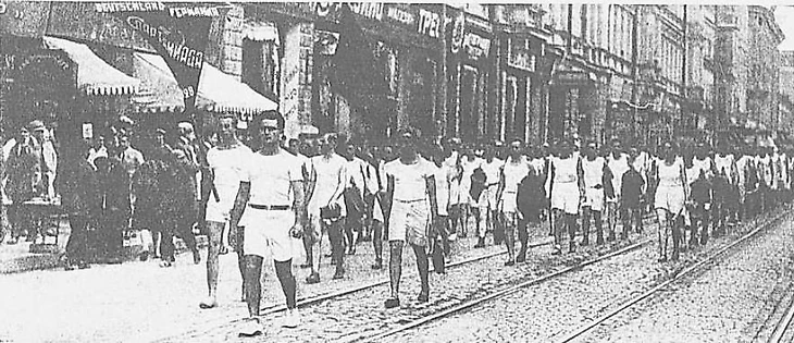 12 августа 1928 года. Москва. Спортсмены Германии направляются на парад в честь открытия Спартакиады (фото из журнала «Физкультура и спорт» № 33 за 1928 год)
