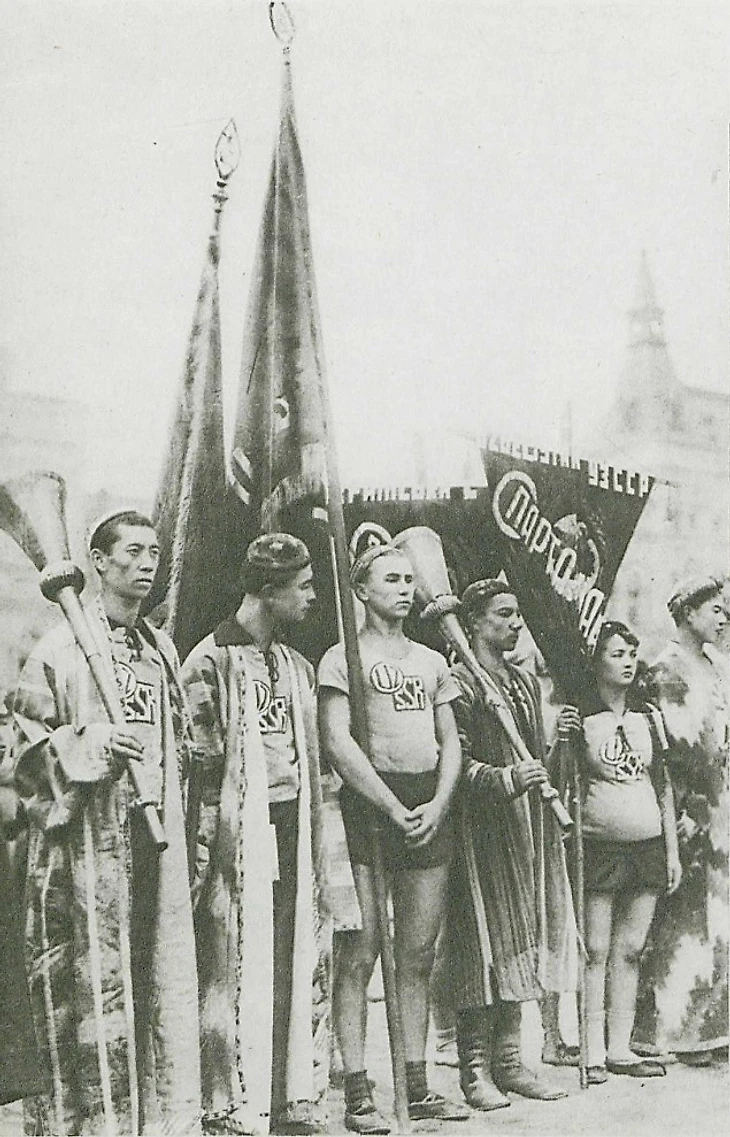 12 августа 1928 года. Москва. Красная площадь. Делегация Узбекской ССР с латиницей на груди - UzSSR. Буквы Uz, расположены в белом круге, скорее всего, символизирующих солнце. Другой символ Узбекистана - «белое золото» - появиться на форме его представителей чуть позднее (скорее всего с 1934 года). Фото М. Альперта