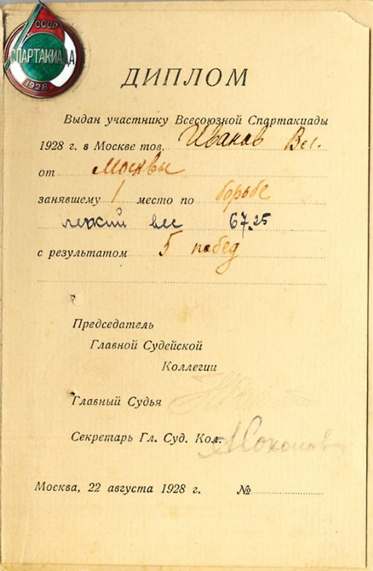 Обратная сторона диплома В. Иванова за первое место и значок (museum.sportedu.ru)