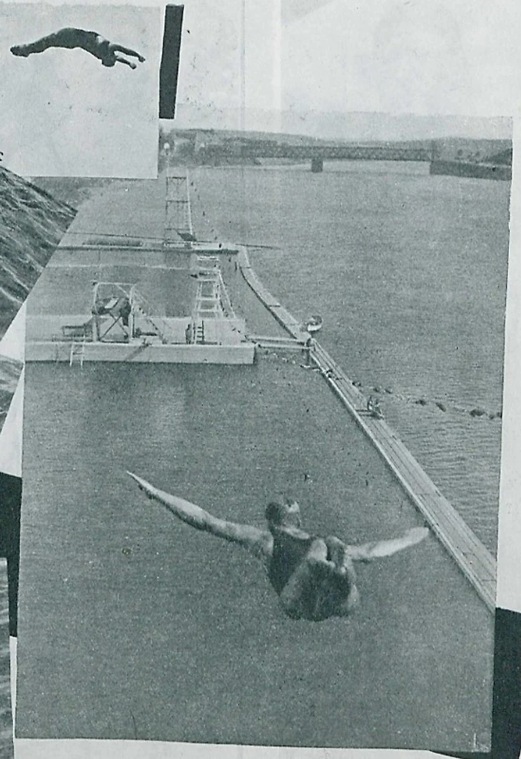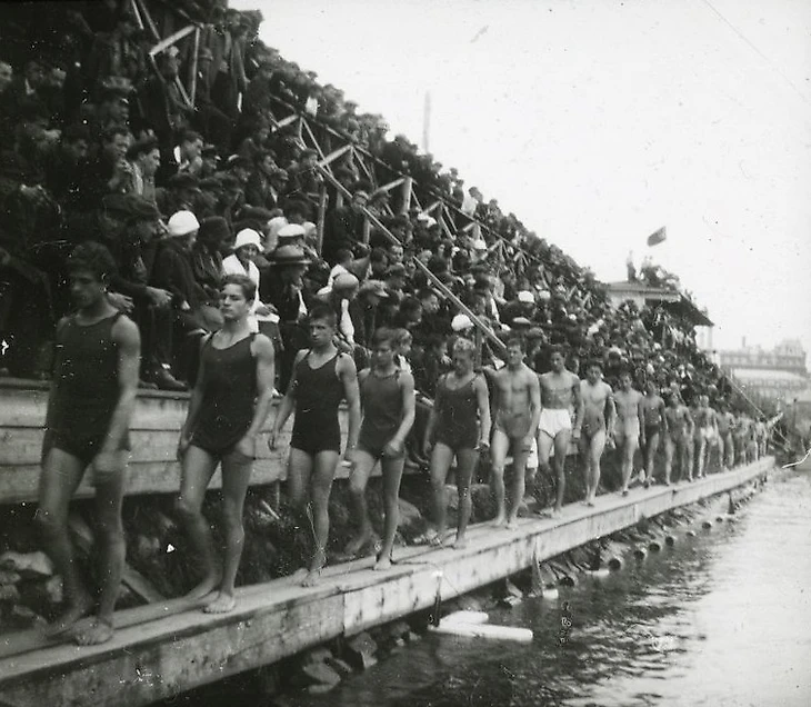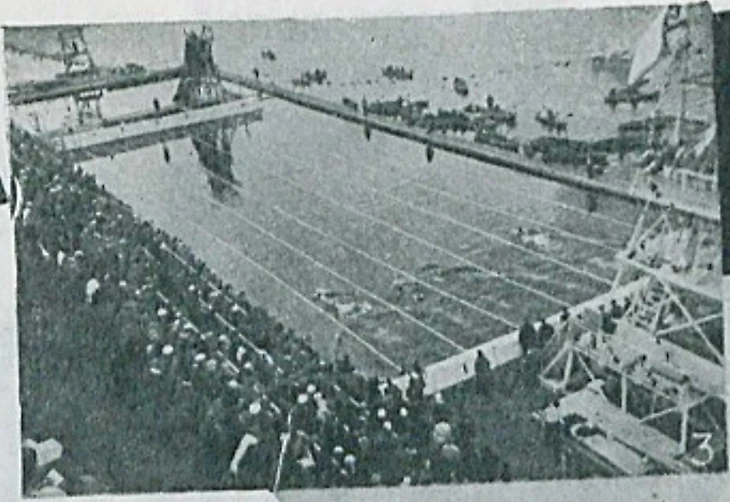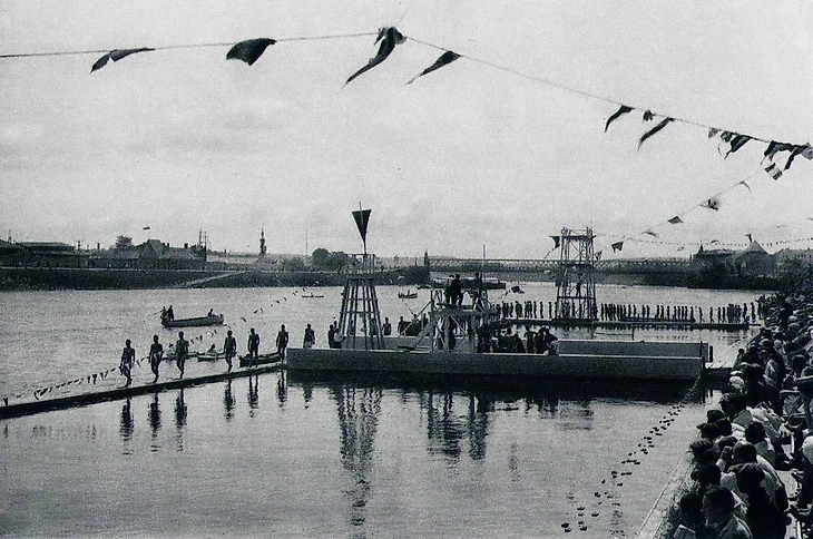 1928 года. Москва. Хамовническая (Фрунзенская) набережная. Водная станция «Динамо». Соревнования по прыжкам в воду. Вид на старый Крымский мост (фото Д. Дебабова)