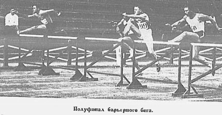 7. Бег с искусственными препятствиями. Команда 5 мужчин. Дистанция в 400 м. Основные препятствия следующие: прохождение по круглому бревну длиною в 6 м, перелезание через частокол в 1,5 м, бег пригнувшись и ползание на расстоянии 20 м, перепрыгивание через барьер высотой 75 см, переноска 5 патронных ящиков на расстоянии 20 м, взбегание на горку высотой 1,5 м и высоко-далекий прыжок с нее через барьер, перелезание через забор высотой в 2,5 м. Все препятствия находится друг от друга на расстоянии примерно 30-45 м» («Всесоюзная Спартакиада - как будут разыграны всесоюзные первенства и призы имени ЦИК СССР» в еженедельнике «Физкультура и спорт» № 20 за 1928 год).