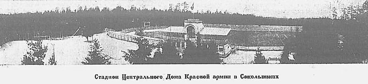 Зима 1927-28 годов. Москва. Сокольническая роща. 4-й Лучевой просек. Стадион ЦДКА. «Площадка ЦДКА (ОППВ) является одной из старейших спортивных площадок Москвы. В 1905 году над Москвой пронесся сильный ураган, в результате которого на теперешнем четвертом просеке Сокольнической рощи образовался большой пустырь; ураган снес огромное количество деревьев. ОЛЛС (Общество любителей лыжного спорта) решило использовать этот пустырь для устройства спортивной площадки. В 1907 году было приступлено к сооружению площадки, постройка которой продолжалась 4 года; 8 октября 1910 года состоялось торжественное открытое новой площадки. После революции, скромная площадка стала целым стадионом. В 1920 г. была построена левая трибуна. В 1924,1925, 1926 гг. были достроены остальные три трибуны. Все трибуны площадки могут вместить 12 000 зрителей. На легкоатлетической дорожке площадки поставлено большинство всех наших всесоюзных, всероссийских и московских рекордов; на ней разыгрывались все первенства Москвы, РСФСР и СССР. В настоящее время территория площадки расширена и на ней устроен малокалиберный стрелковый тир; к Спартакиаде будут готовы тренировочная легкоатлетическая дорожка и тренировочное футбольное поле. Площадка ЦДКА связана с городом хорошим трамвайным и автобусным сообщением» (журнал «Физкультура и спорт» № 27 за 1928 года)