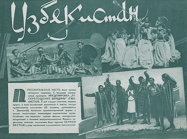 Инсценировка «Раскрепощение женщины», в которой было задействовано сорок два артиста (художественный руководитель - Змиевский), принесла Узбекистану победу в первенстве по смешанным национальным пляскам
