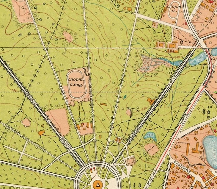 1937 год. План Москвы (фрагмент). Парк ЦДКА имени М.В. Фрунзе. Уже появился теннисный стадион (в 1928 году его еще не было). Через дорогу от армейского пруда, зимой служившего катком, стадион Союза совторгслужащих (стадион ССТС) в Самарском переулке до революции принадлежавший московскому отделению спортклуба «Унион» из Берлина. К Олимпиаде-80 в том числе и на месте этого стадиона, уже называвшегося «Буревестником», будет возведен спорткомплекс «Олимпийский» (retromap.ru)