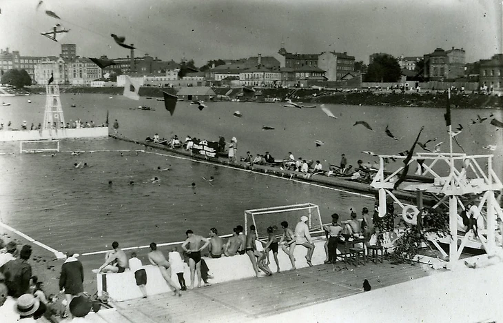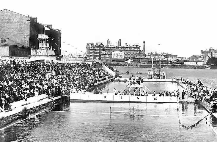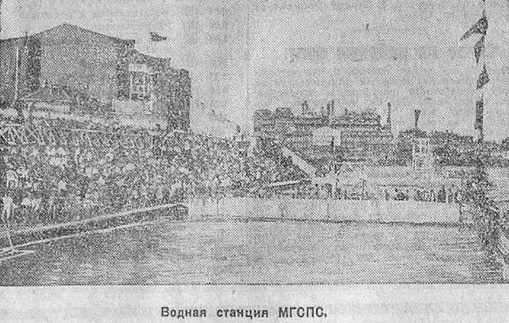 Август 1928 года. Москва. Хамовники. Кропоткинская набережная. Водная станция МГСПС (фото из газеты «Известия ЦИК СССР и ВЦИК» от 17 августа 1928 года)