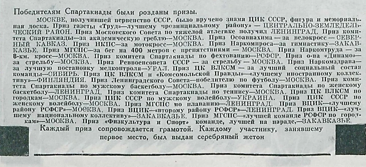 «В зачетных соревнованиях разыгрываются три приза имени ЦИК СССР за три первых места. Кроме того, учреждаются три приза для лучших команд спортивных районов РСФСР. Помимо розыгрыша общекомандного первенства Всесоюзной Спартакиады по всех семи зачетных видах соревнований, в каждом из семи этих видов разыгрывается и отдельное командное первенство Спартакиады по данному виду спорта. В отличие от общекомандного первенства, здесь районы РСФСР принимают участие на равных с Союзными республиками условиях и занимают, следовательно, соответствующие порядковые места, получая также в случае благоприятного для них исхода соревнования и те призы (художественные грамоты), которые в числе пяти устанавливаются по каждому отдельному виду спорта». («Всесоюзная Спартакиада - как будут разыграны всесоюзные первенства и призы имени ЦИК СССР» в еженедельнике «Физкультура и спорт» № 20 за 1928 год).