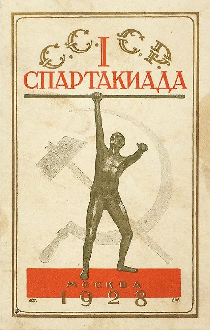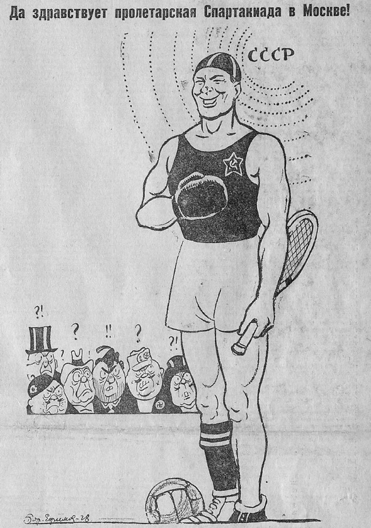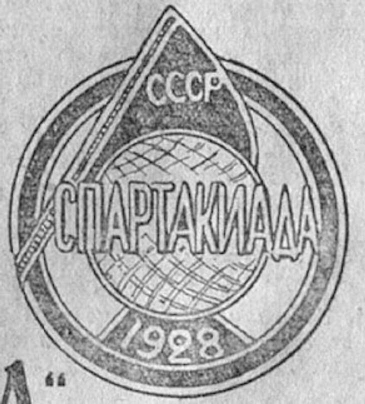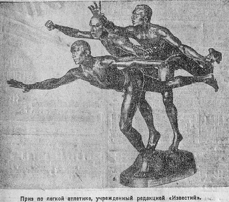 Рисованное приветствие Спартакиаде в газете «Известия ЦИК СССР и ВЦИК» (печатный орган Центрального исполнительного комитета СССР и Всероссийского ЦИК Советов рабочих, крестьян и красноармейцев), опубликованное на первой полосе номера за 12 августа 1928 года