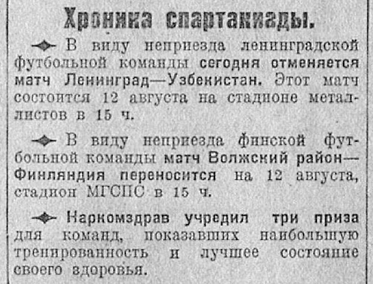 «В дополнительных играх по календарю союзных республик Узбекистан окончательно развенчал Швейцарию, выиграв в дополнительное время 8:4. Туркменистан, выезжавший для встречи с Англией в Орехово, выиграл 4:2» (альбом «Спартакиада» под общей редакцией В. Михельса, Москва, 1928 год).