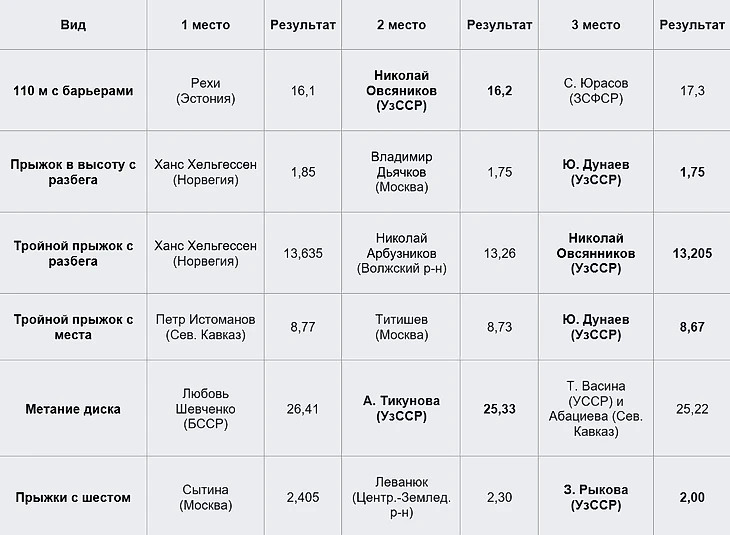 И прежде чем перейти к итогам общекомандных соревнований Спартакиады, нужно отметить еще одну дисциплину, где успешно выступили посланцы солнечного Узбекистана: «Основным номером программы Армейских соревнований, «проведенных на Спартакиаде и в честь Спартакиады, было ставшее в Красной армии традиционным военно-прикладное многоборье, состоящее из перехода на 25 км, стрельбы и штурма укрепленном полосы. <...> Большой интерес представляло также спортивное многоборье. Почти во всех номерах командами были показаны великолепные достижения, а в некоторых случаях даже исключительные. Например, в лазании по канату один участник пролез около 50 м. Программа многоборья была, по сравнению с прошлым годом, сильно изменена. Были введены такие упражнения, как метание гранаты в цель, метание гранаты на дальность из положения лежа, кросс и т. п. Эти видоизменения программы вполне себя оправдали. Все соревнование прошло в сильной борьбе, и победа досталась команде Средне-Азиатского военного округа, второе место - команде Белорусского ВО и третье - команде Флота» (альбом «Спартакиада» под общей редакцией В. Михельса, Москва, 1928 год).